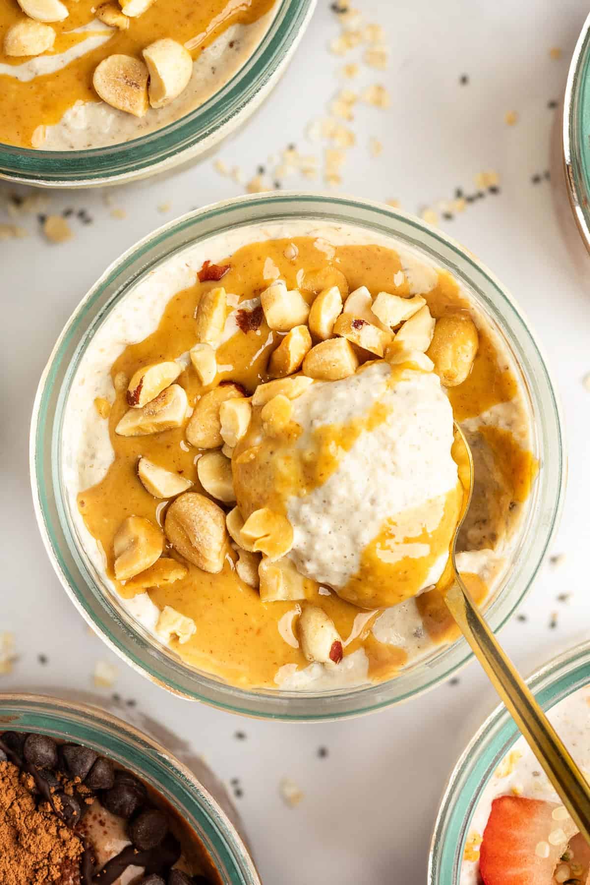 As always, we encourage you to make breakfast your own! This is a very basic peanut butter overnight oats recipe that is both vegan and gluten-free (f you use certified g/f oats). We love adding protein-boosters and extra fruit to our overnight oats. Check out some of our recommendations below.