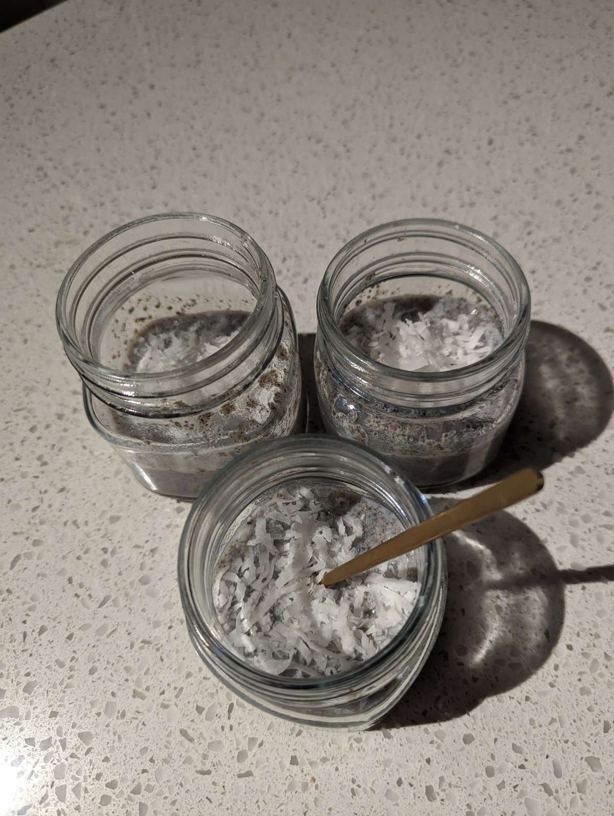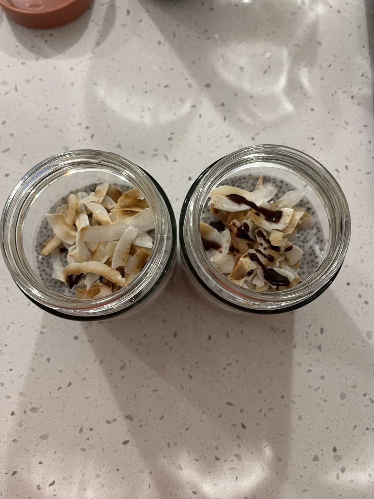 - After 2 hours (or longer) when the chia seed pudding is thick and creamy, use a ½ cup to separate it into 4-6 containers. Top each cup with whip and toasted coconut. Enjoy.