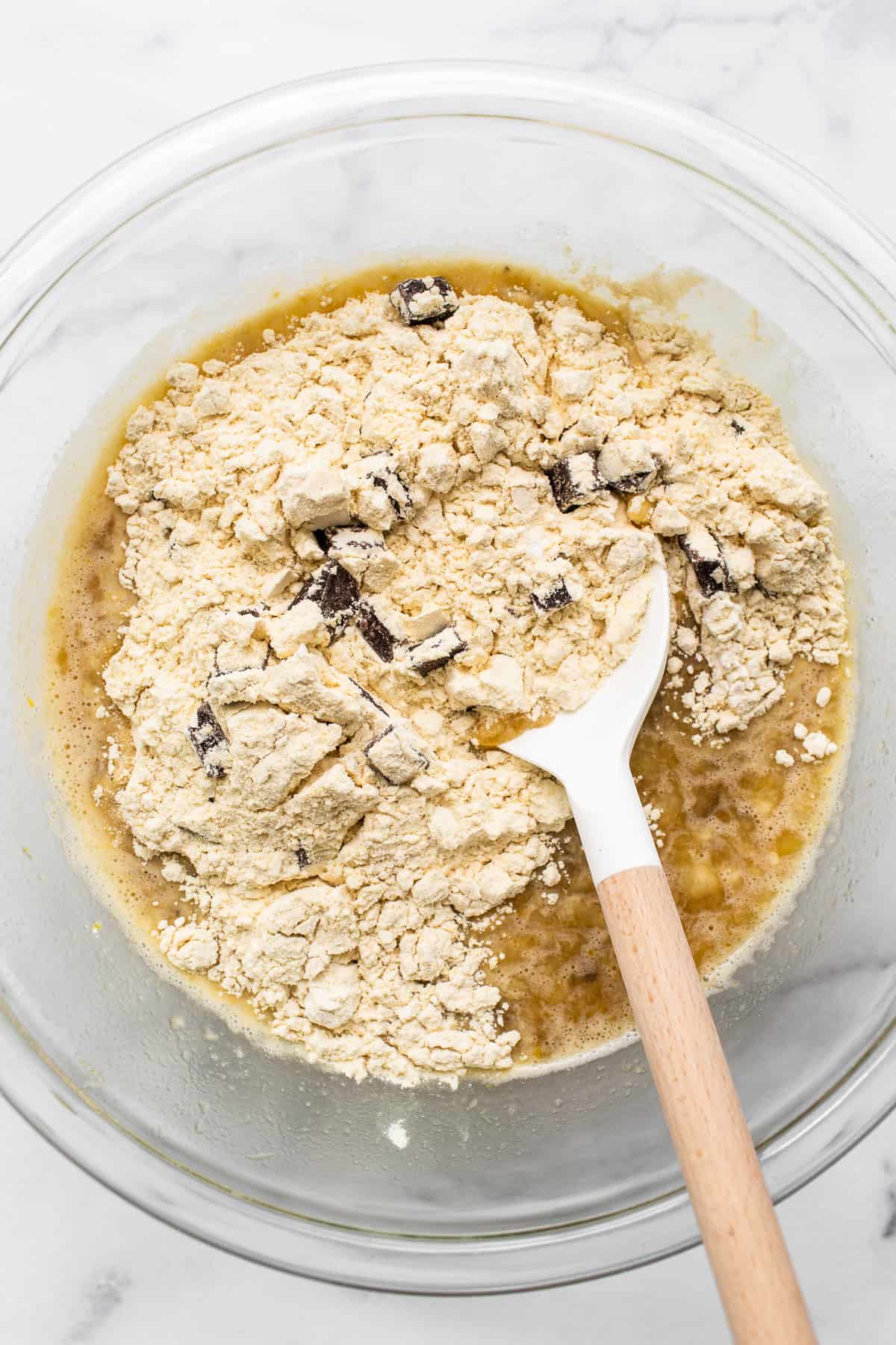 - Transfer the dry ingredients to the wet ingredients and stir the batter until well combined. Add melted coconut oil and mix again.