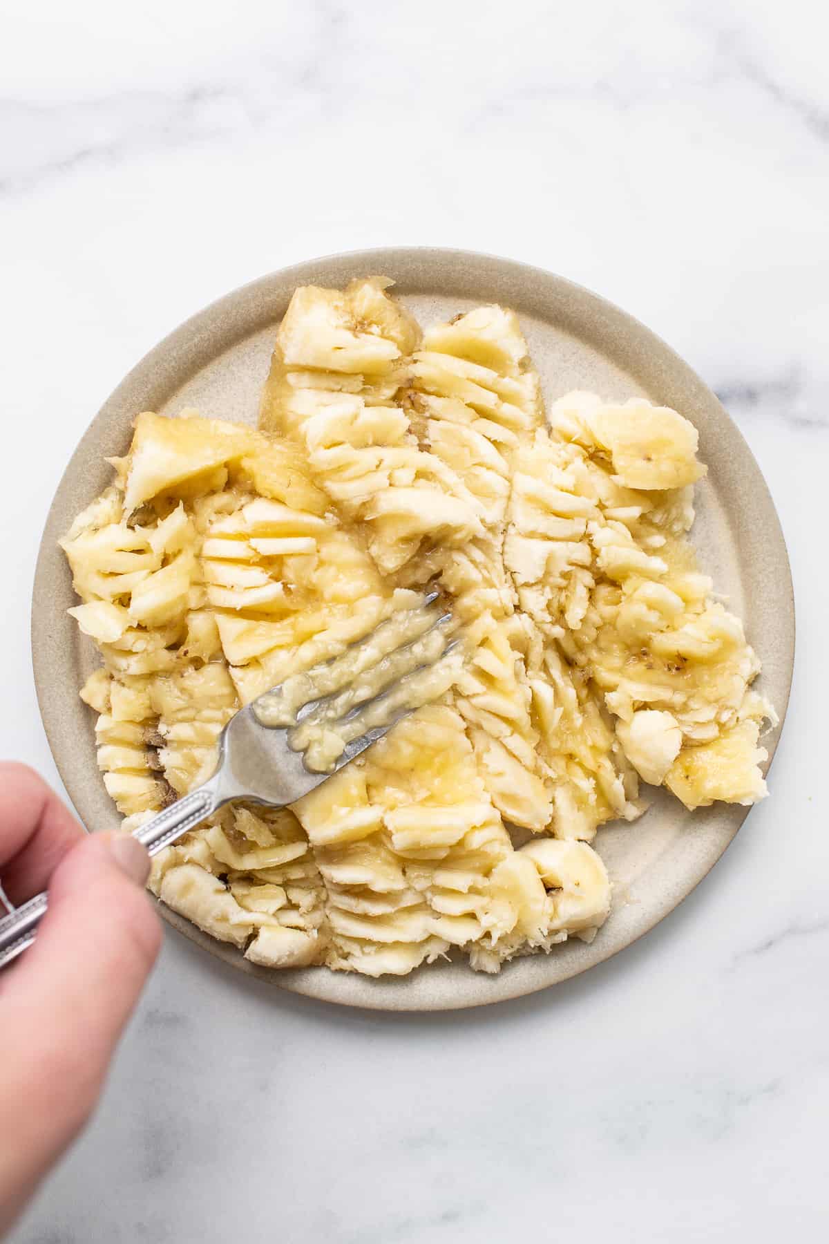 - We think it’s easiest to mash a banana on a plate with a fork and then measure it in a measuring cup once it’s mashed.