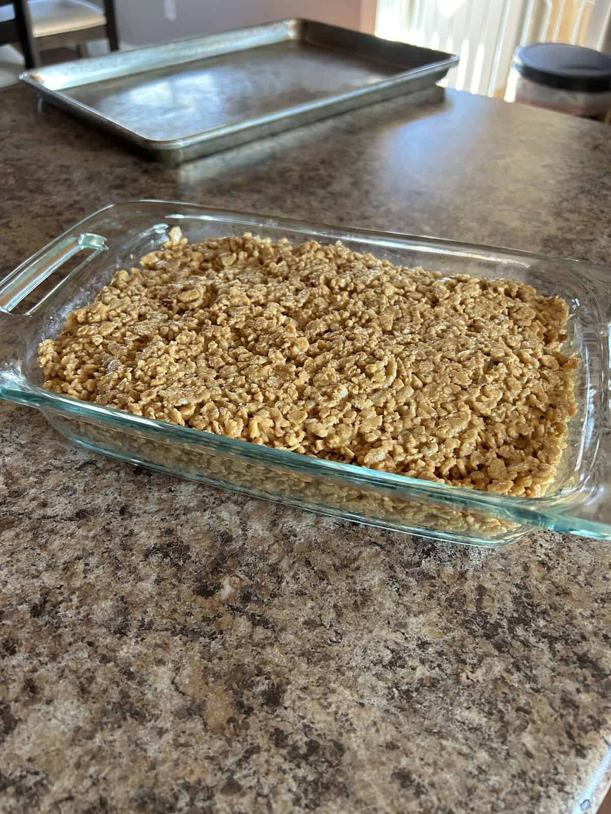 - Pour the rice-crispy mixture into the lined pan. Press the rice crispies firmly down to the bottom of the pan with your hands. Set aside.