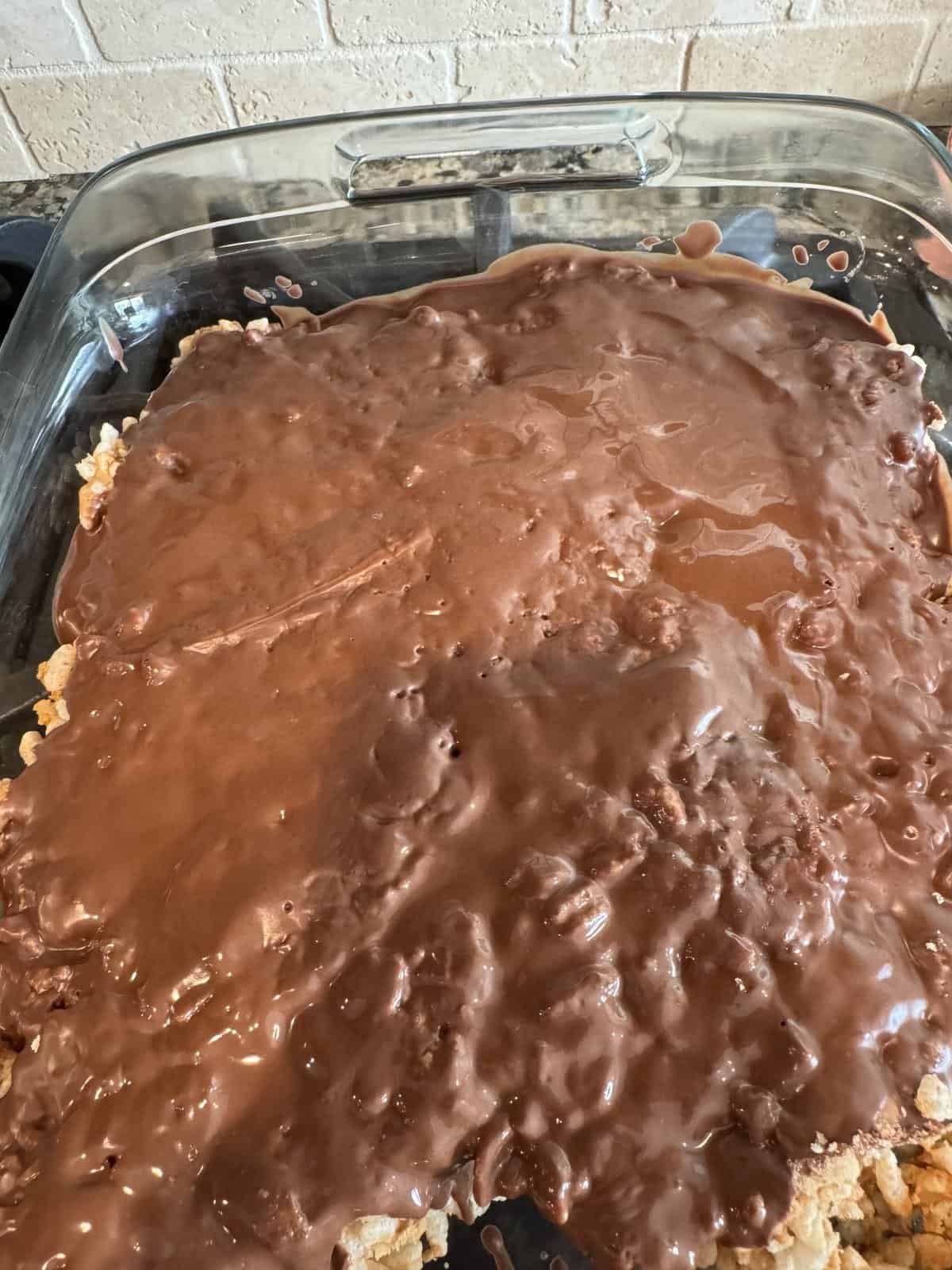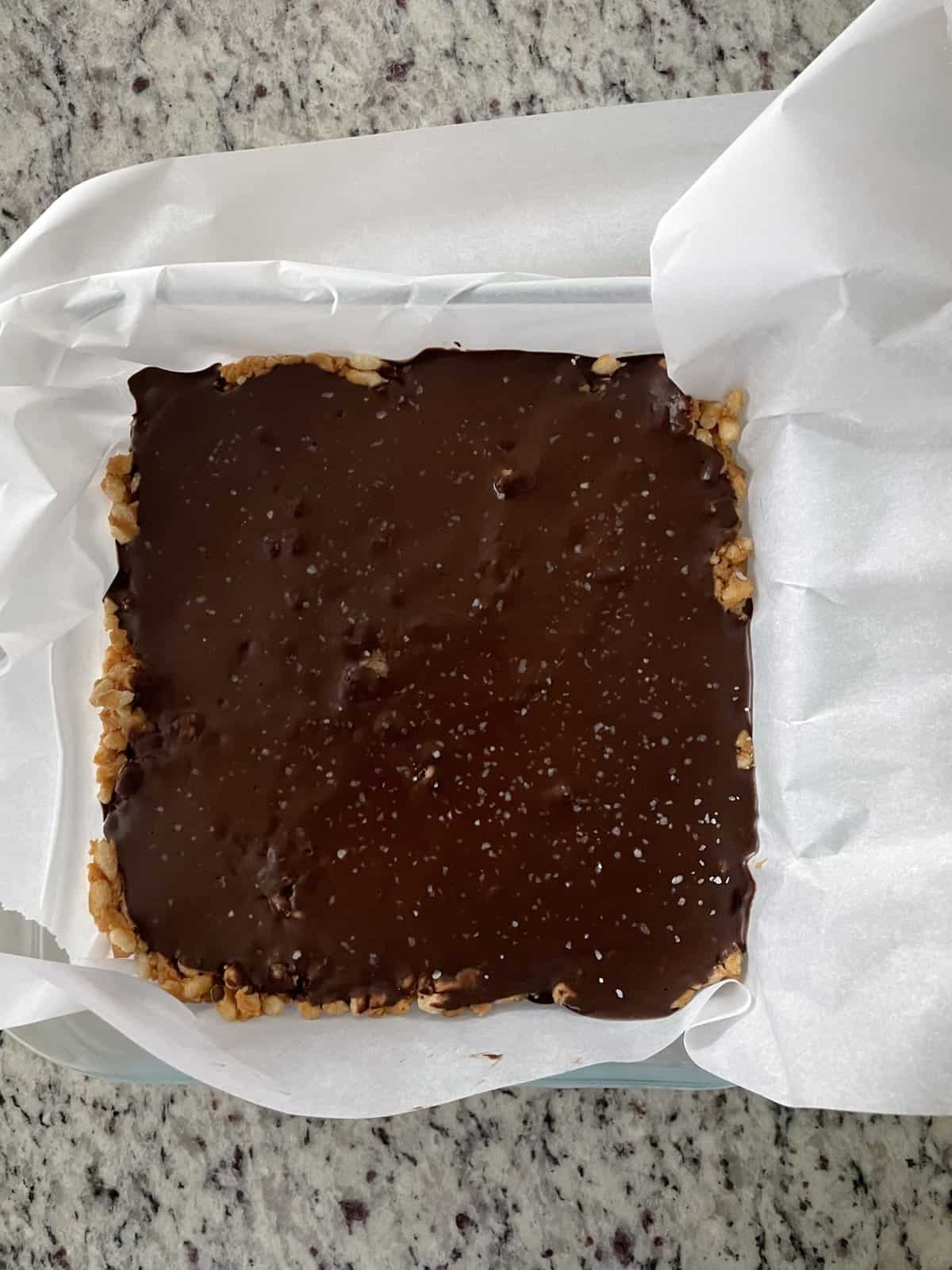 - Pour the chocolate over the rice crispies and use a spatula to evenly distribute. Sprinkle on coarse sea salt, if desired.