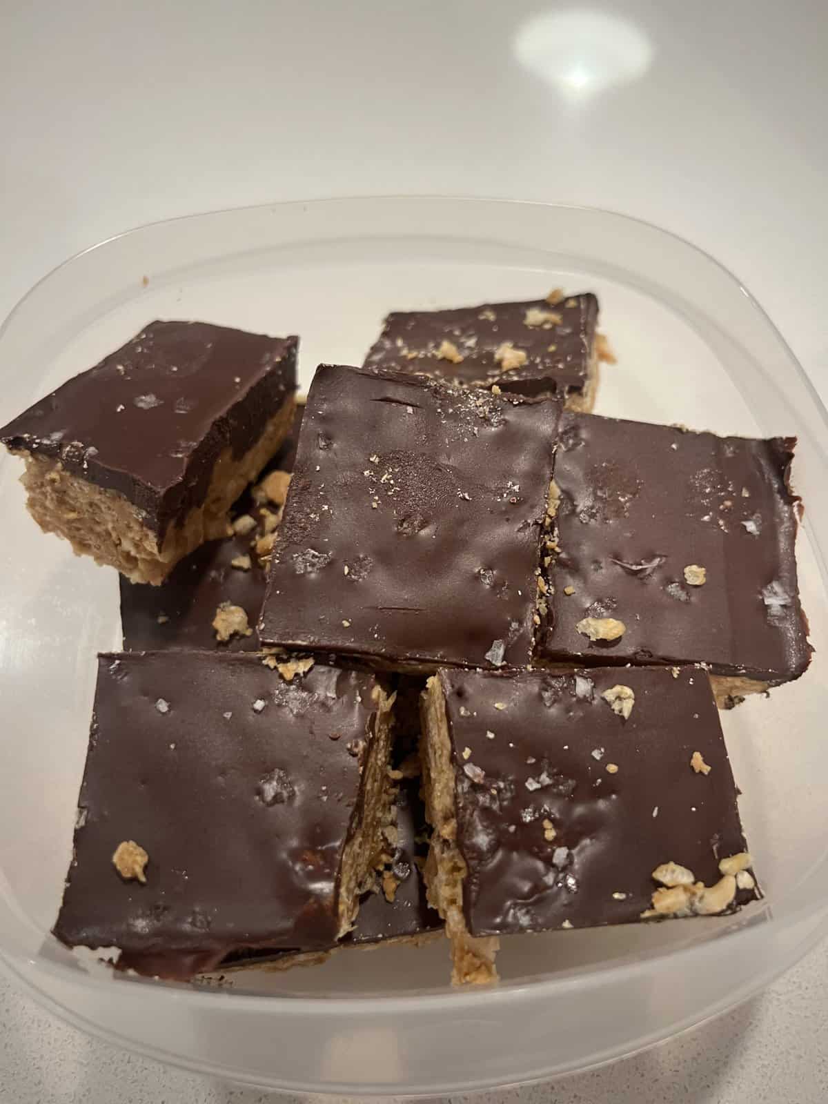 After slicing the scotcheroos, store them in an airtight container in the fridge or freezer. We don’t recommend storing these at room temperature as the coconut oil will cause the bar to not hold its shape.