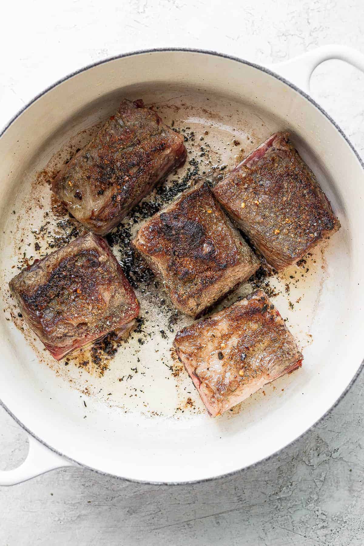 - When the olive oil is fragrant, add the short ribs to the dutch oven without crowding the pot. Sear the short ribs for 2-3 minutes on each side. You may have to do this in batches depending on the size of the ribs and dutch oven.