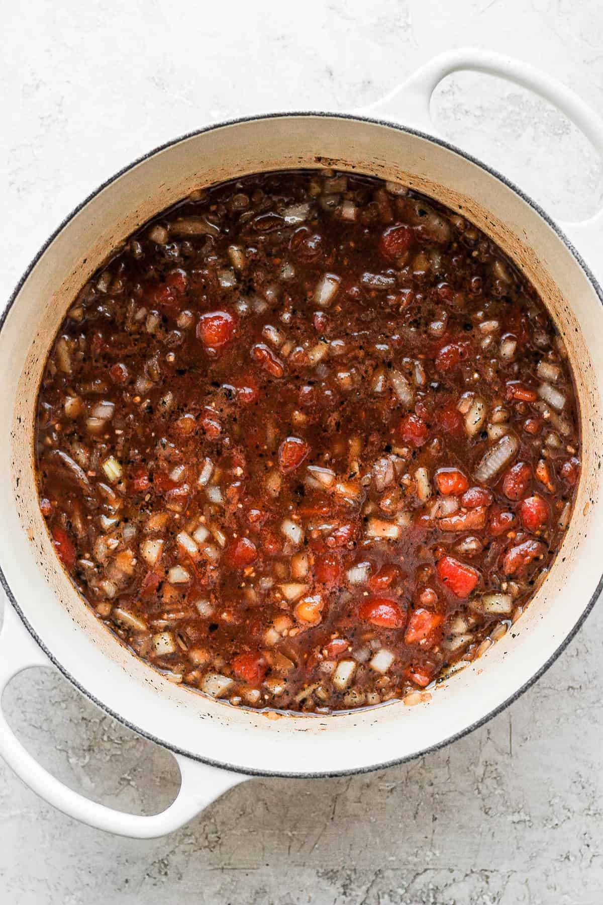 Finally, add the red wine, tomato paste, anchovy paste, Worcestershire sauce, and diced tomatoes to the dutch oven and whisk until combined.