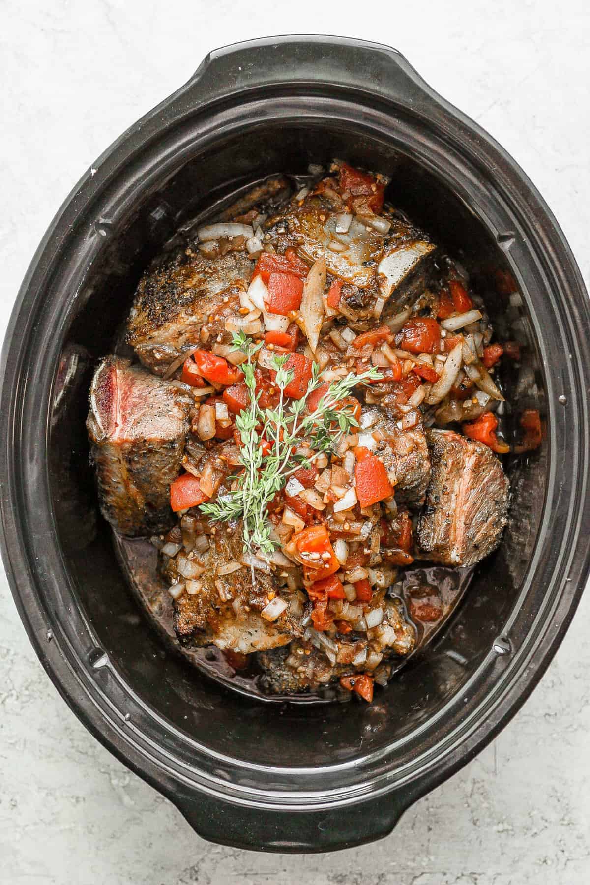 - Add the fresh thyme to the slow cooker and cook the short ribs on low for 8 hours.