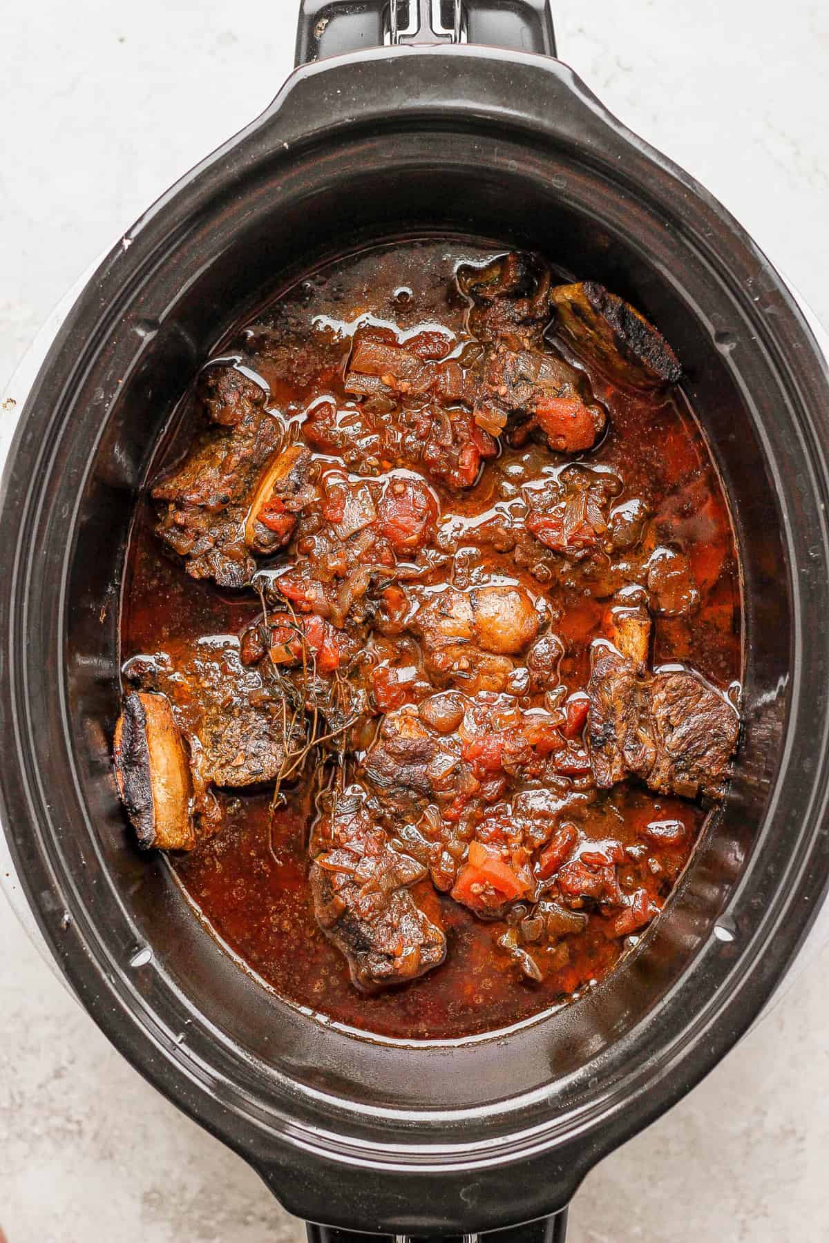 Shred the beef. When the short ribs are cooked and fall off the bone, remove the ribs and place them on a large plate or baking sheet. Remove bones from the short ribs and discard them. Shred the beef with two forks and return the beef back into the slow cooker.