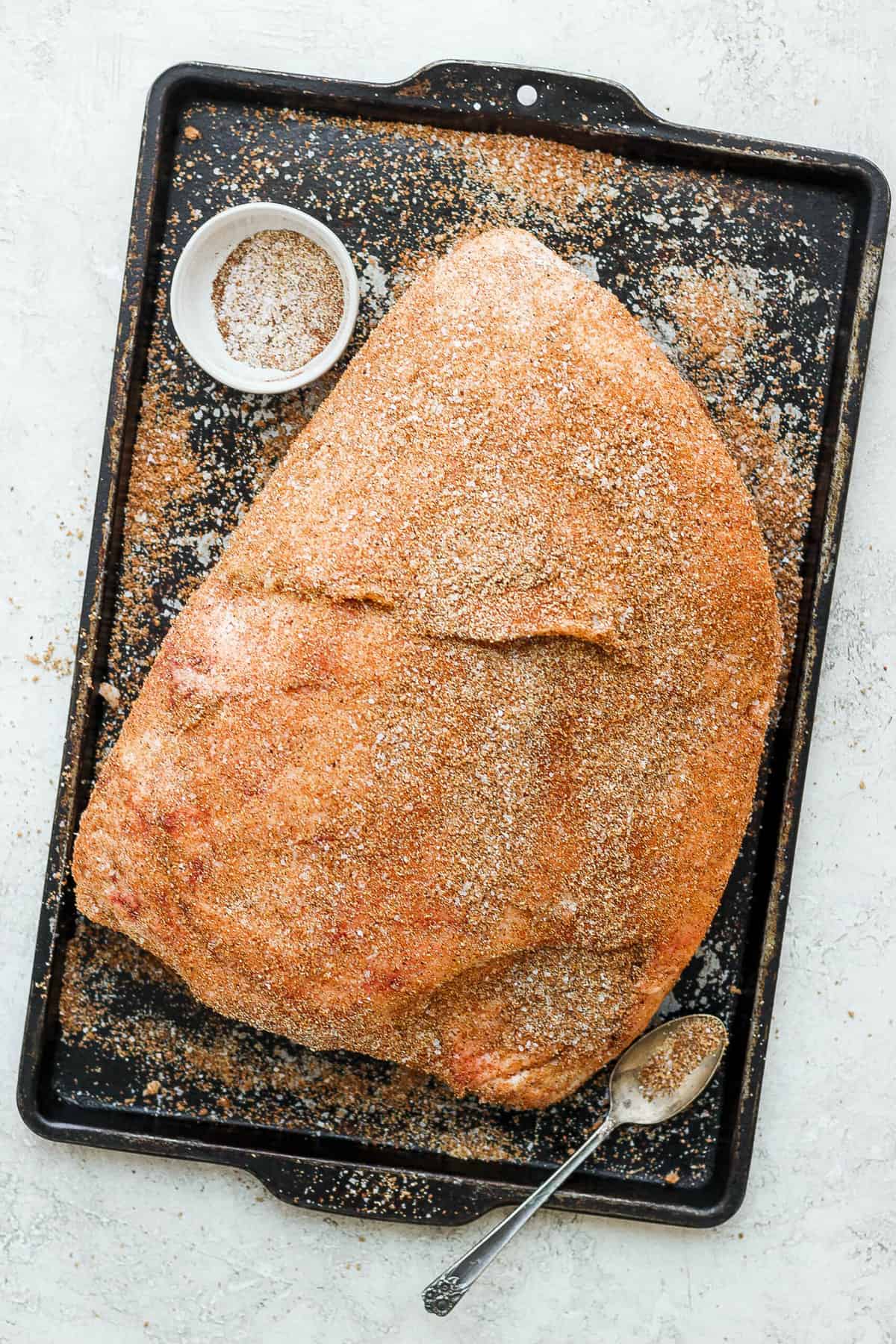 - Remove the ham from the brine and pat dry with a paper towel. Transfer the ham to a baking sheet and carefully massage the dry rub over the whole ham. Be sure to massage the dry rub into every crevice. Let the rubbed ham rest for 15 minutes.