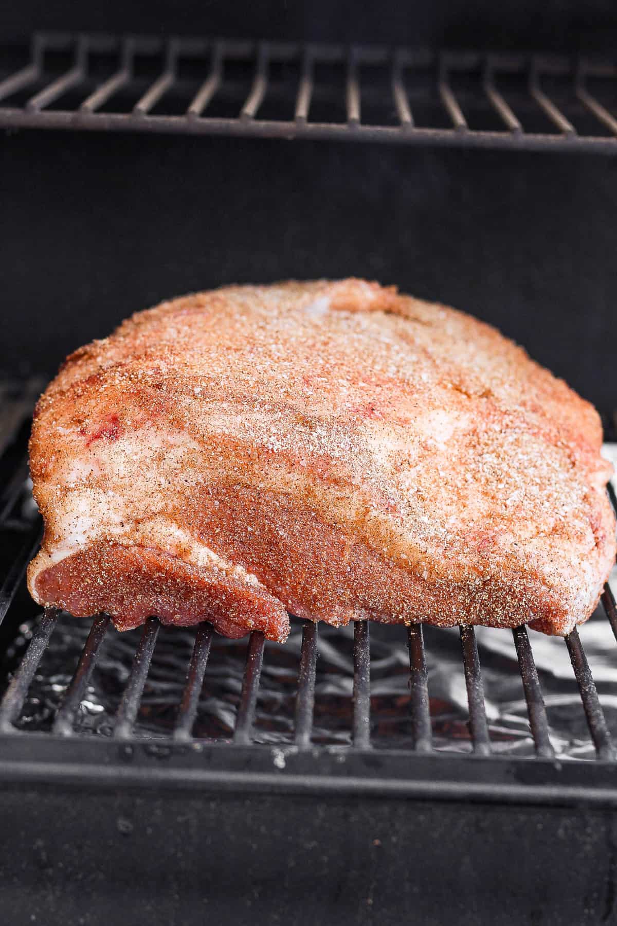 This recipe has been tested with pork shoulder and picnic ham. Both were delicious. The smoke time will vary based on how large the cut of meat is. Just be sure to check the internal temperature of the meat periodically.