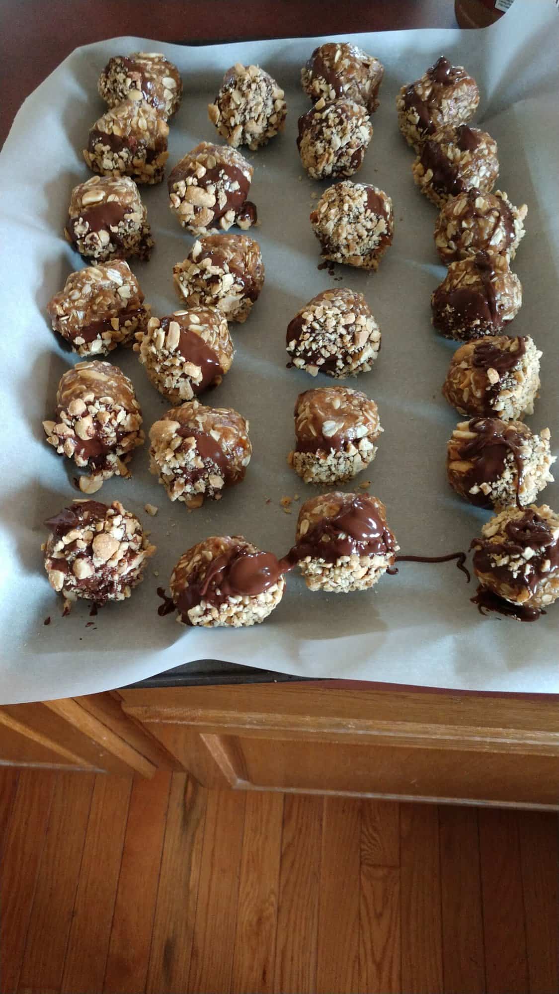 - Once the chocolate is melted dip each ball into the melted chocolate so that half of the ball is coated in chocolate. Sprinkle the ball with crushed peanuts and sea salt. Repeat this process until all the balls are coated in chocolate.