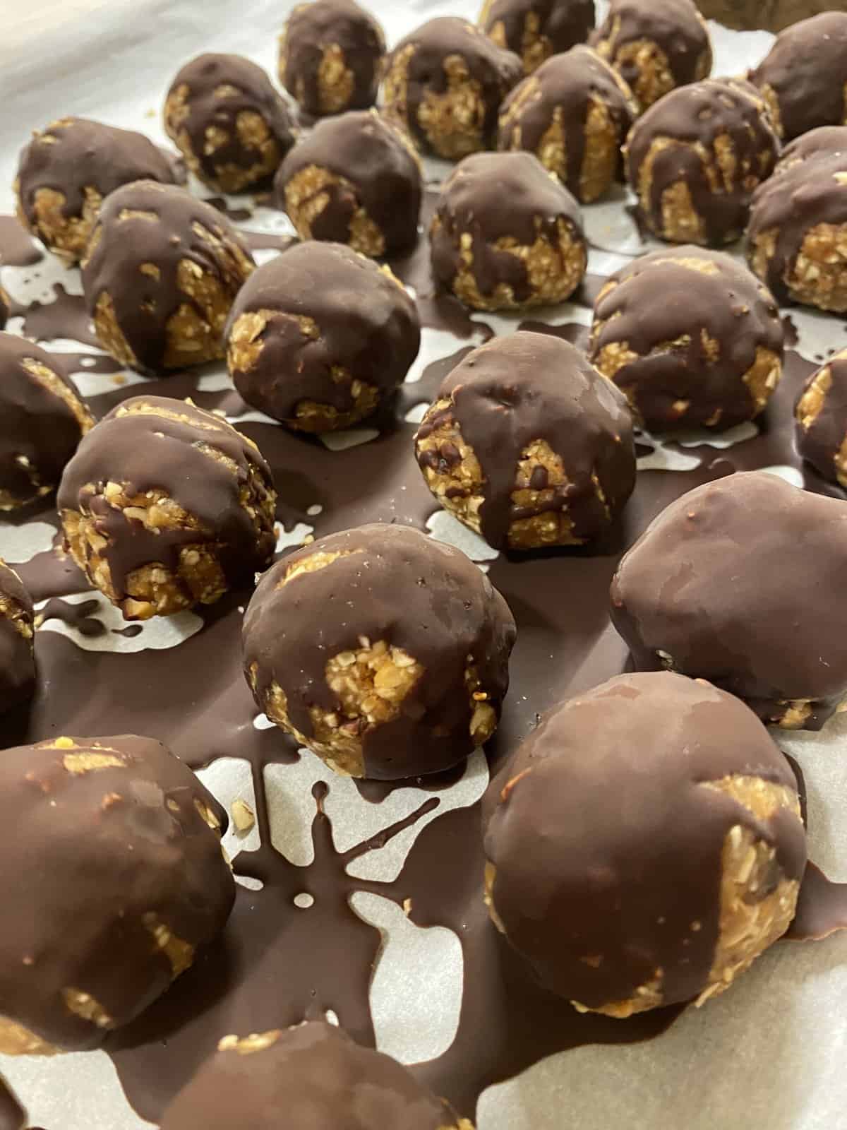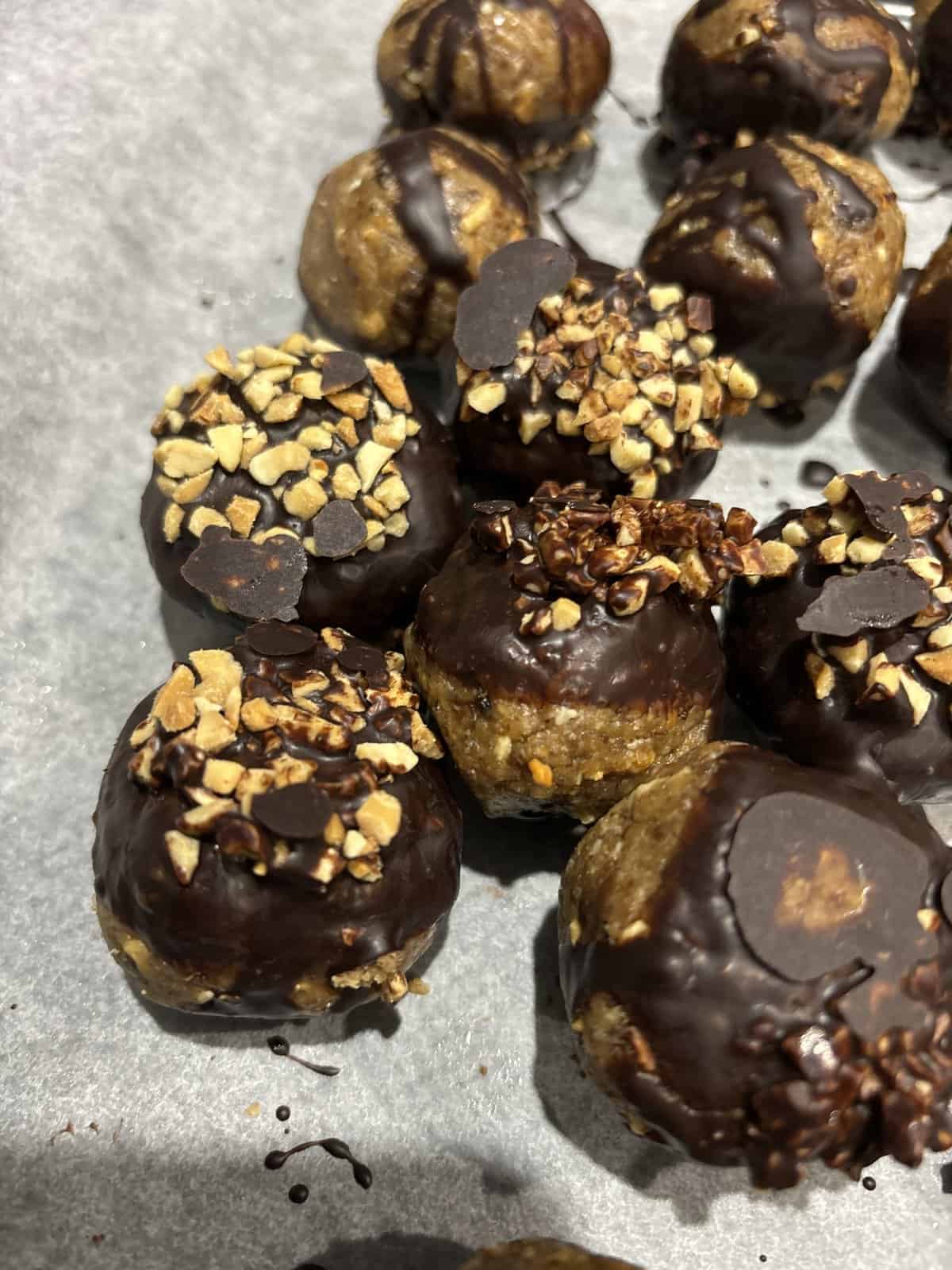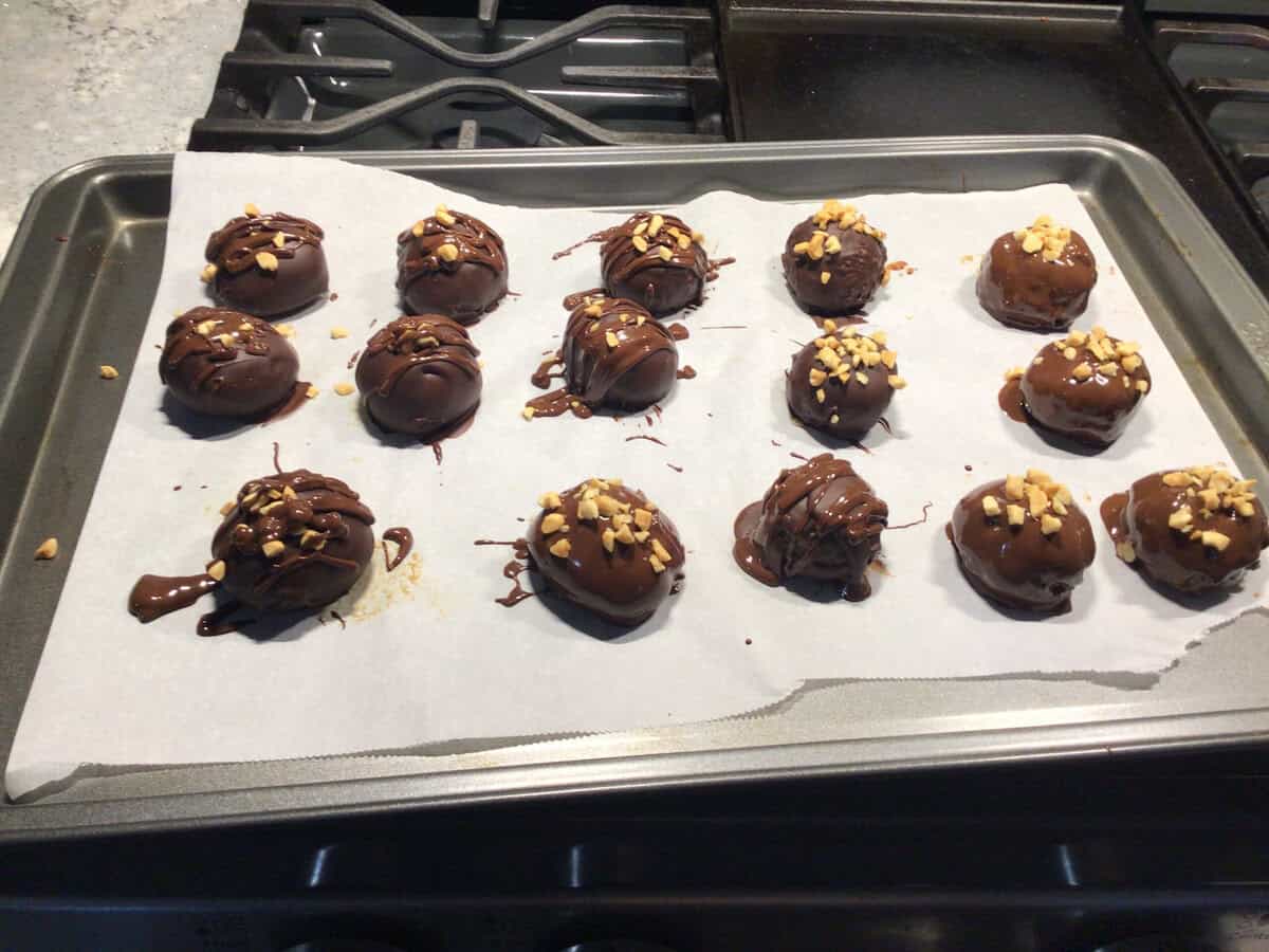 - Set the balls on a plate and transfer them to the freezer for 20 minutes or until the chocolate has set.