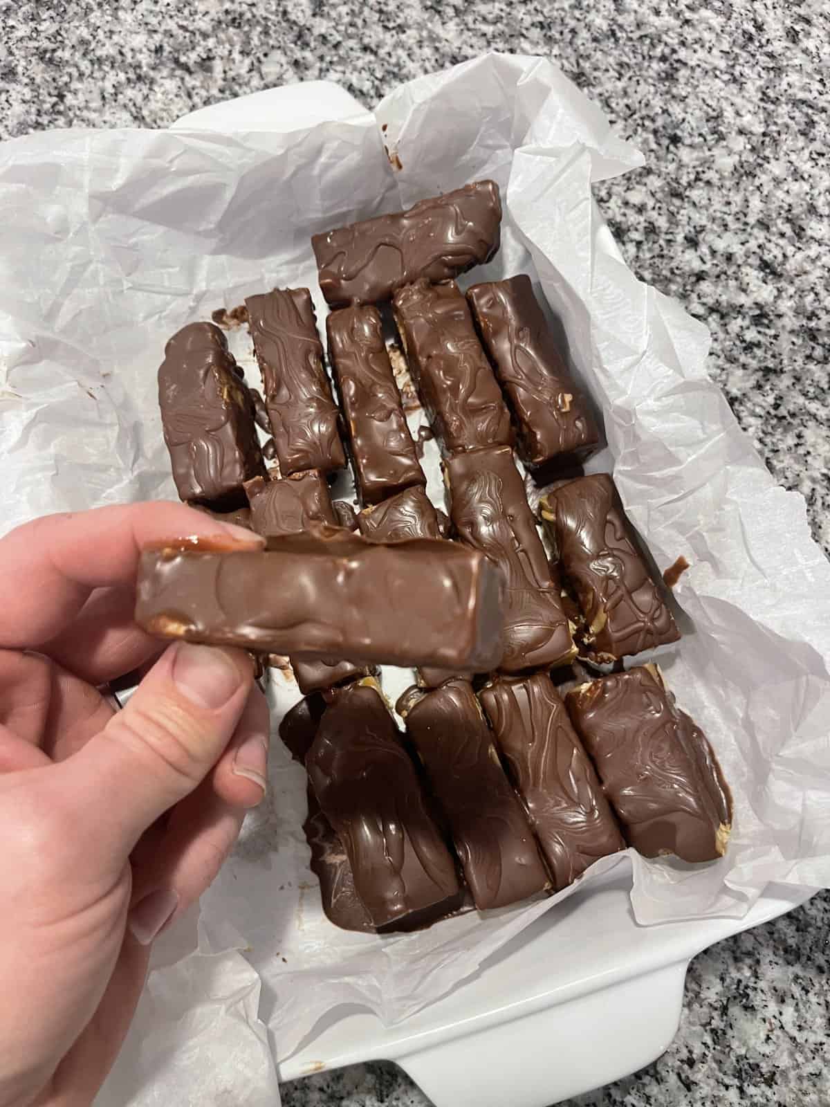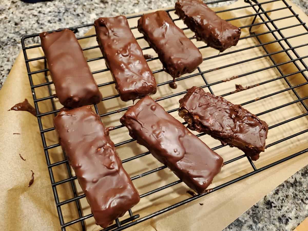 - Make the Snickers Bars. While the bars are still frozen (working quickly is important!), place one bar into the bowl at a time and spoon chocolate over it, completely coating it. Let any excess chocolate drip off the bar and then place it onto the wire rack. Repeat until all bars are coated. Option to sprinkle each bar with sea salt.