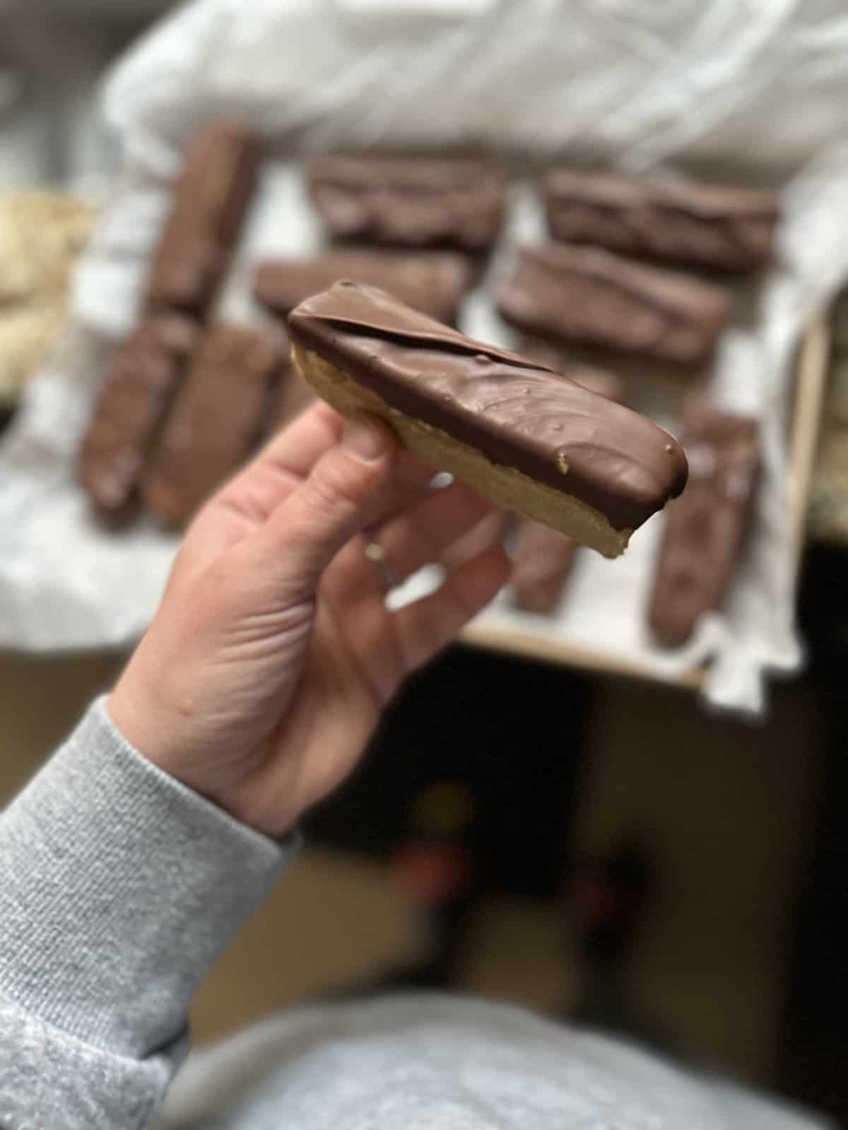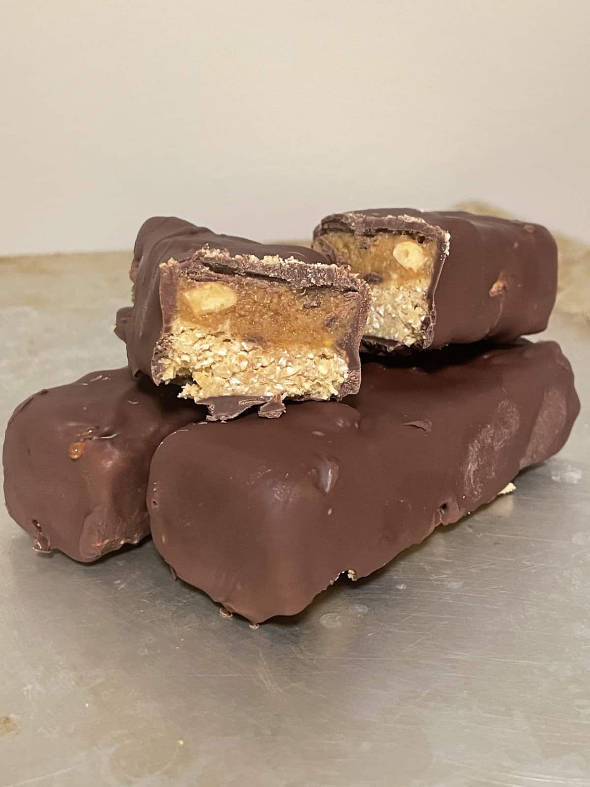 This recipe is composed of 3 different layers. The first layer is the oat nuget layer made with oat flour, protein powder, peanut butter, and maple syrup. The second layer is the crunchy peanut butter caramel layer made with peanut butter, maple syrup, coconut oil, and peanuts. Finally, the 3rd layer is melted chocolate.