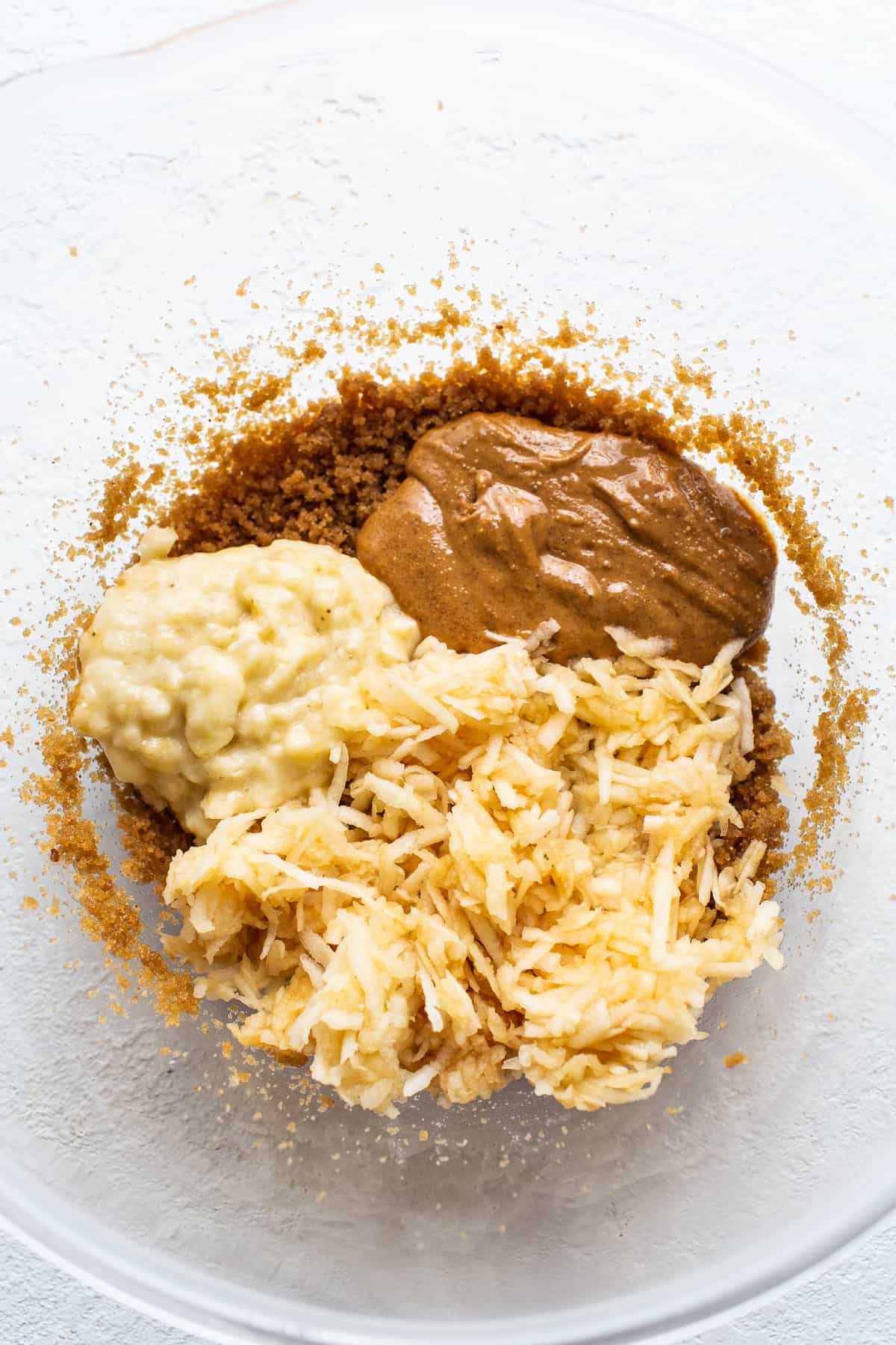 - In a large bowl, cream together brown sugar, oil, and vanilla. Add the peanut butter, grated apples, and banana. Mix again until combined. Add eggs and gently mix until combined. Lastly, add the almond milk until combined.