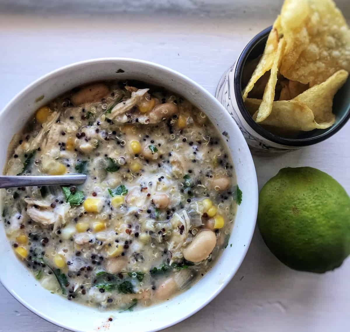 Homemade white chicken quinoa chili is a delicious twist on a classic. This version is made with everything we love about traditional white chicken chili with delicious additions like quinoa, salsa verde, and toasted cauliflower crunchies on top!