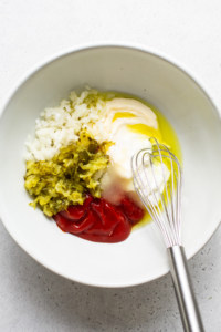 Prepare the burger sauce. Add the mayonnaise, Greek yogurt, ketchup, onion, pickles, pickle juice, and granulated sugar to a bowl and mix until completely combined. Transfer to the refrigerator for later.